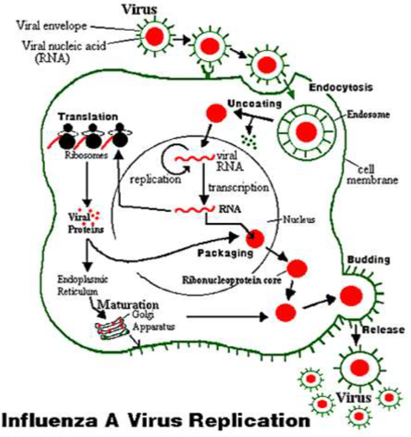 當(dāng)流感病毒入侵人體時,血凝素(HA)經(jīng)由細(xì)胞膜融合進(jìn)入宿主細(xì)胞。神經(jīng)氨酸酶(NA)從感染的細(xì)胞內(nèi)被釋放出來,協(xié)助流感病毒進(jìn)入細(xì)胞復(fù)制并向外擴(kuò)散。