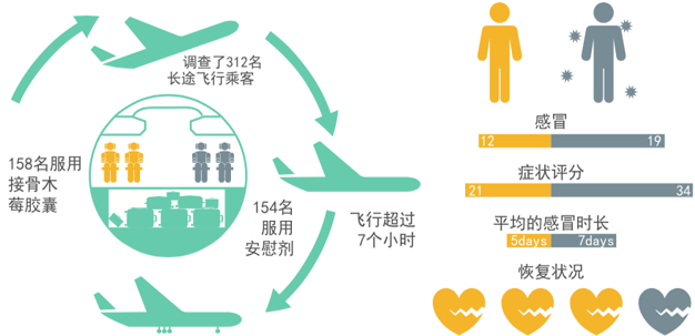 60名流感患者,隨機(jī)分成接骨木莓組和安慰劑組,15ml/次接骨木莓糖漿或安慰劑,一天4次,服用5天。接骨木莓組的疼痛,咳嗽,鼻塞充血,呼吸道粘液,睡眠質(zhì)量及總體評價明顯更快得到改善。(滿分10為無病癥狀)