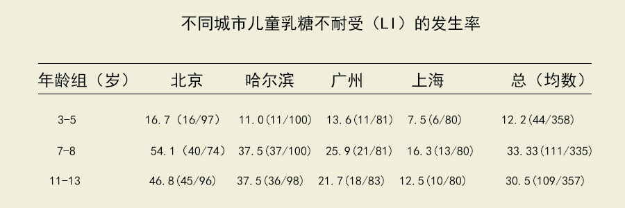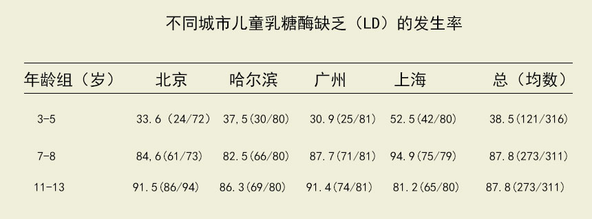 小孩子發(fā)生這種癥狀并不少見。1999年中國營養(yǎng)學(xué)會楊月欣等在哈爾濱、北京、上海和廣州四大城市對3—13歲兒童隨機抽取1168名,進行乳糖不耐測試,結(jié)果表明, 我國兒童乳糖不耐缺乏(LD)的發(fā)生率有隨年齡增長而升高的趨勢,發(fā)生率在兩位數(shù)以上。